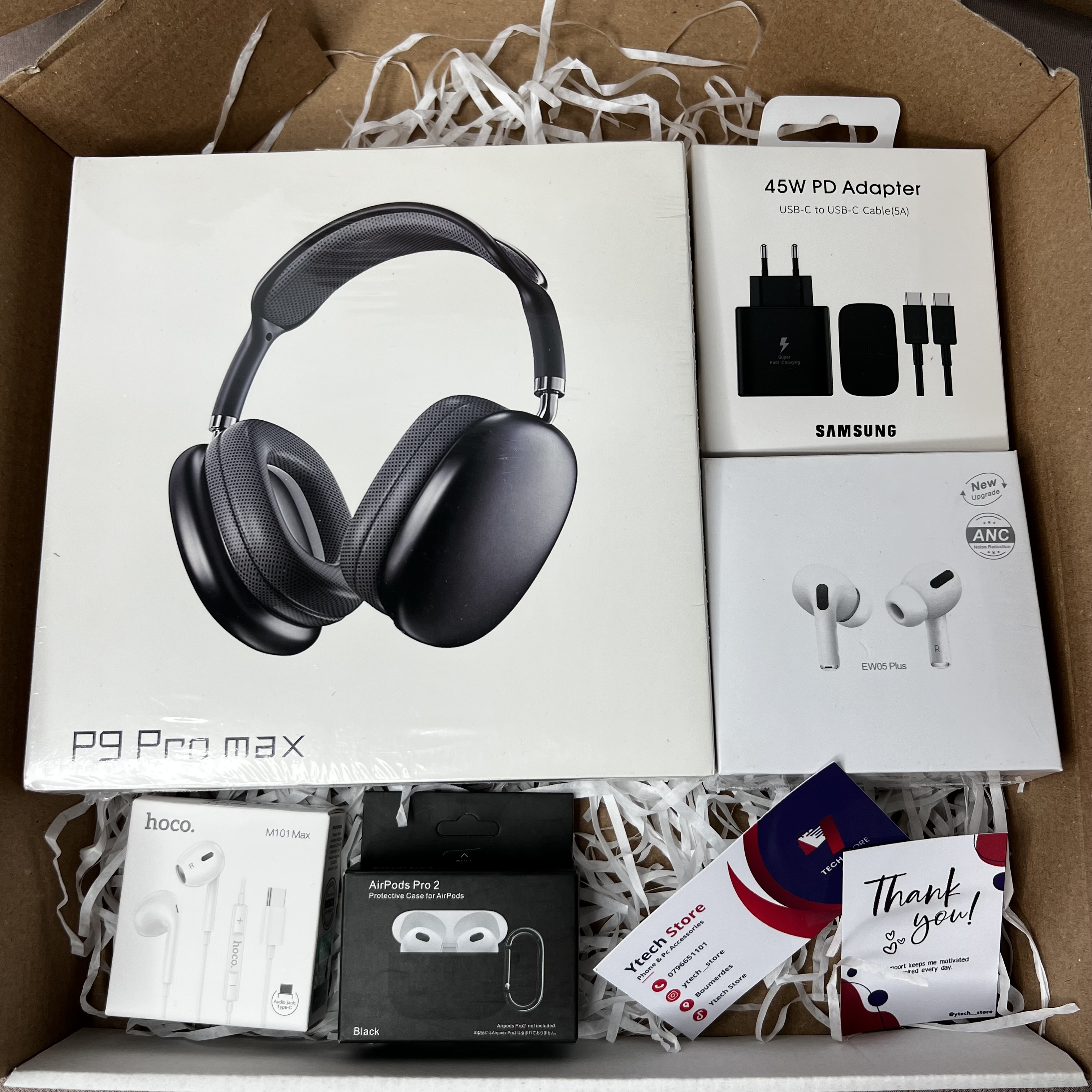 P9 pro max + airpods hoco ew05 plus + chargeur samsung 45W + airpods case + kit type c hoco